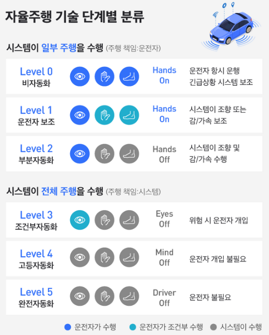 - Level 4: '특정 조건' 내에서는 차량이 완전한 자율주행 수행 (책임 소재: 제조사)