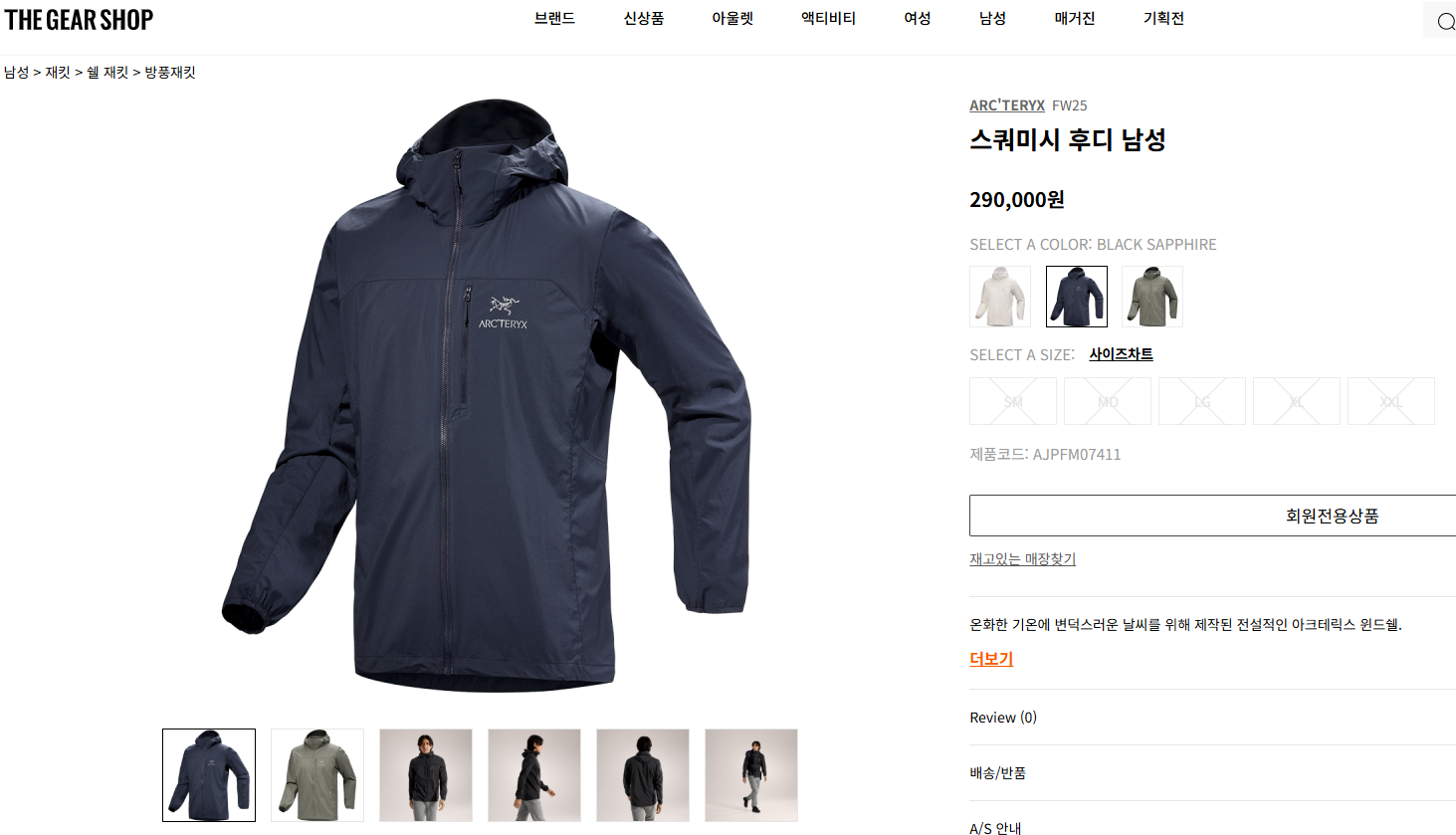 이번 시즌 아크테릭스 25FW 라인업 중 스쿼미시 후디 판매를 시작했고, 인기 색상은 이미 빠르게 솔드아웃.