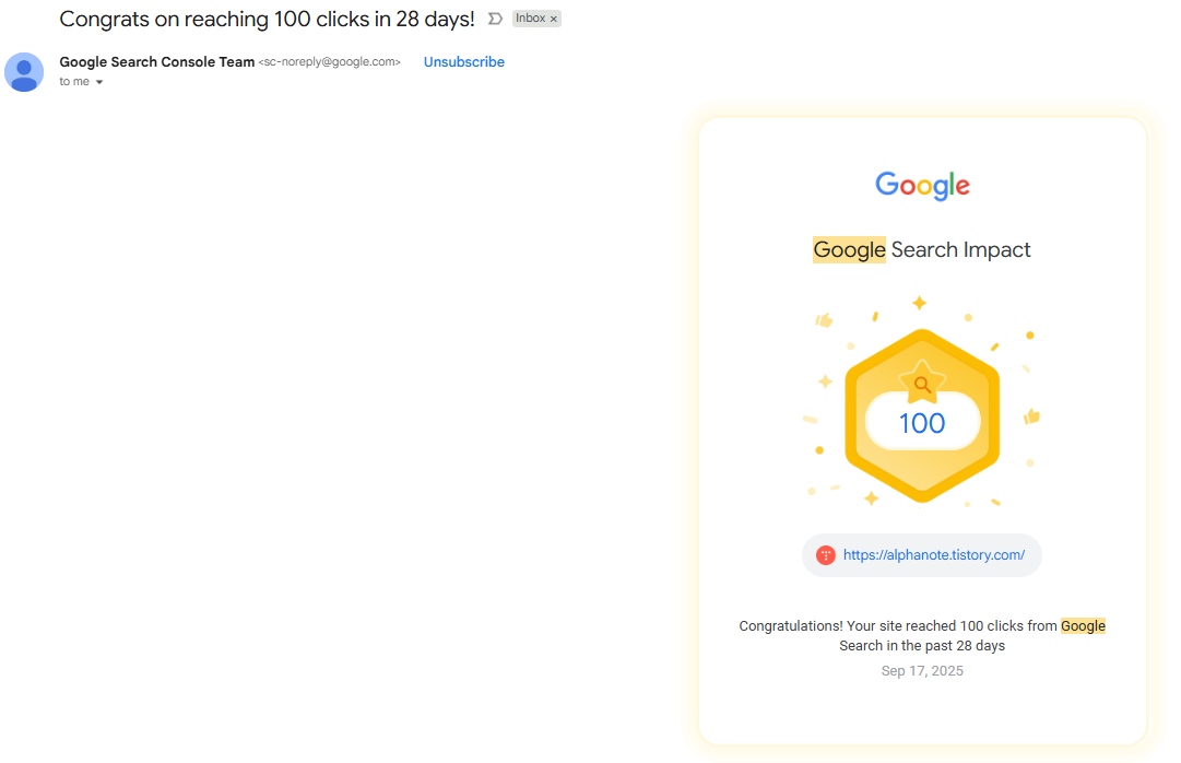 실제로 내가 9월 22일쯤, 최근 28일간 구글 검색을 통한 유입이 100회를 넘겼다는 축하 메일을 받았다.