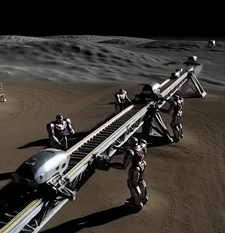 - 전기로 탄환을 쏘는 초고속 대포 같은 ‘레일건’ 을 달 표면에 깔고, 그걸로 완성된 모듈을 통째로 궤도로 발사한다.