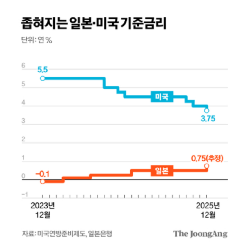 이게 유독 기사화가 많이 되는 이유는 - 일본이 금리를 올리면 엔화가 흔들리고, 엔캐리 포지션이 재정리되면서 자금 흐름이 흔들리고, 그 충격이 환율과 주식시장으로 전이되는 구조이기 때문이다. 작년 8월에 일본 금리인상으로 한 번 겪었듯이, 일본은 워낙 낮은 금리와 엔캐리 구조가 오래 누적돼 있던 만큼, 작은 변화에도 시장 반응이 빠르고 예민하게 나타나는 편이다.
