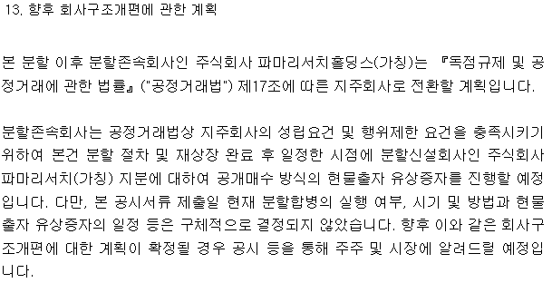 여기서 중요한 포인트는, 홀딩스가 지주회사 요건을 충족하기 위해 일정 시점에 신설법인의 지분을 확보할 계획이라는 점이다.
