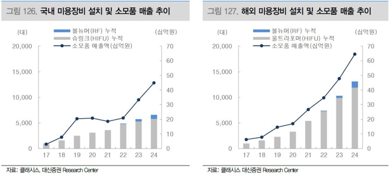 반면, 클래시스는 장비+소모품이라는 반복 수익 구조를 갖고 있다. 대표 장비인 슈링크와 볼뉴머 같은 HIFU/RF 장비를 피부과에 설치하고, 이후 팁, 카트리지 등 소모품을 꾸준히 공급하면서 매출이 쌓이는 모델이다.