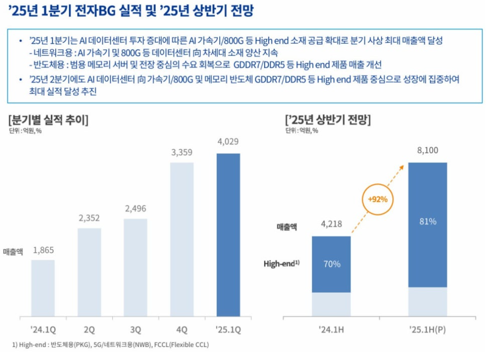 이미 지난해 11월부터는 세계 1위 AI 반도체 기업 엔비디아에 공급을 시작했고, 고사양 CCL 시장에서 이미 선두에 올라왔다.